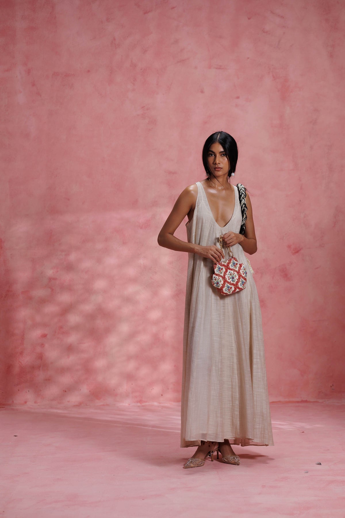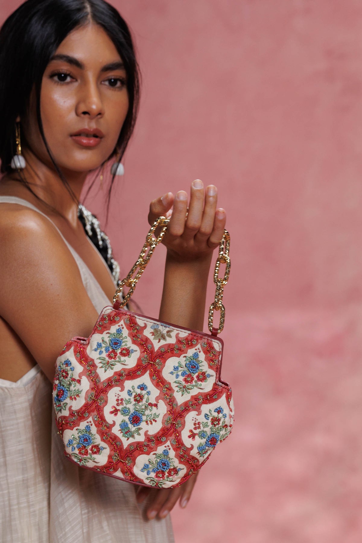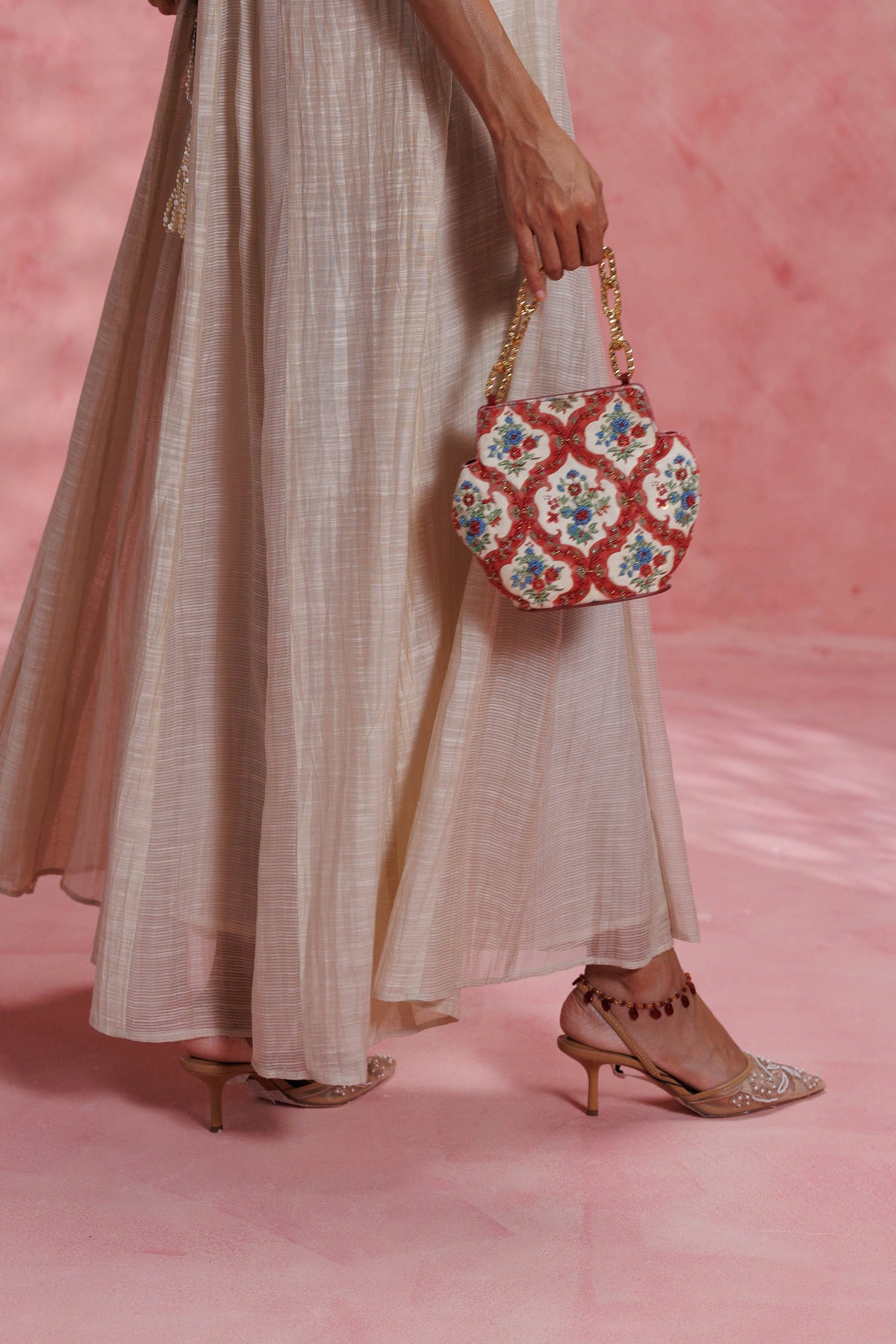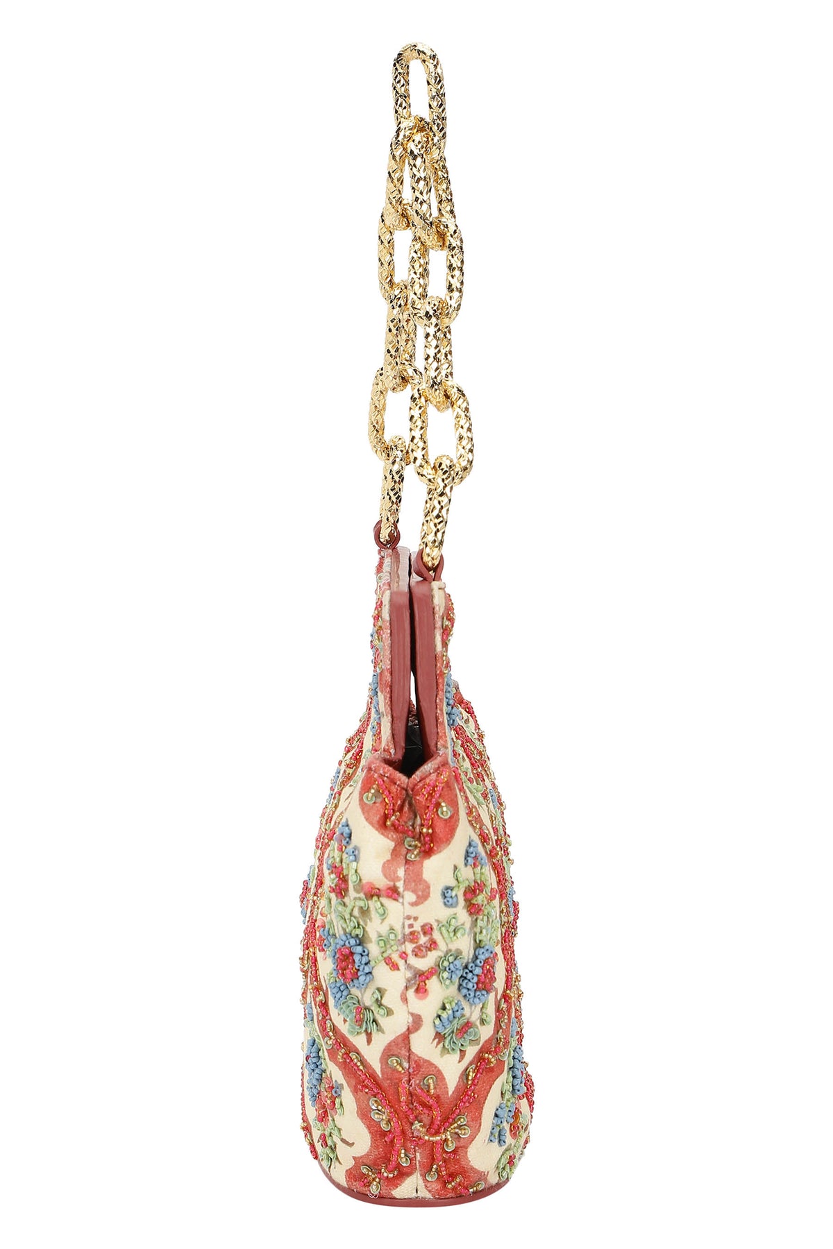 Any variations in the leather or the fabric are the characteristic of the product and add to its beauty and uniqueness. To avoid any accumulation of dust, please store your product in its dust bag when not in use. To maintain the shape of the bag, please keep the bag with its original stuffing when not in use. Embroidery and embellishment is done by hand and should be handled with care. Exposure to liquids may cause damage. Keep away from sunlight and extreme temperatures.