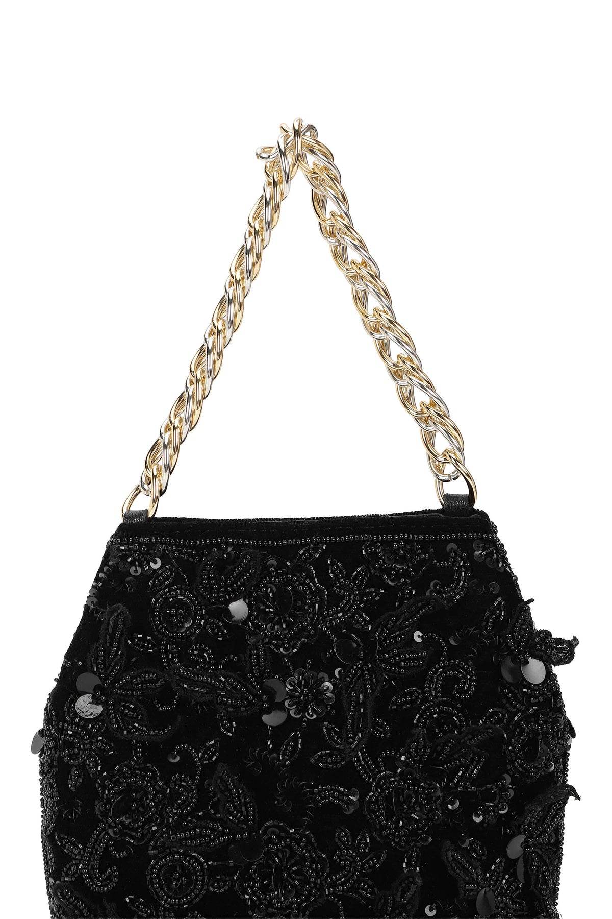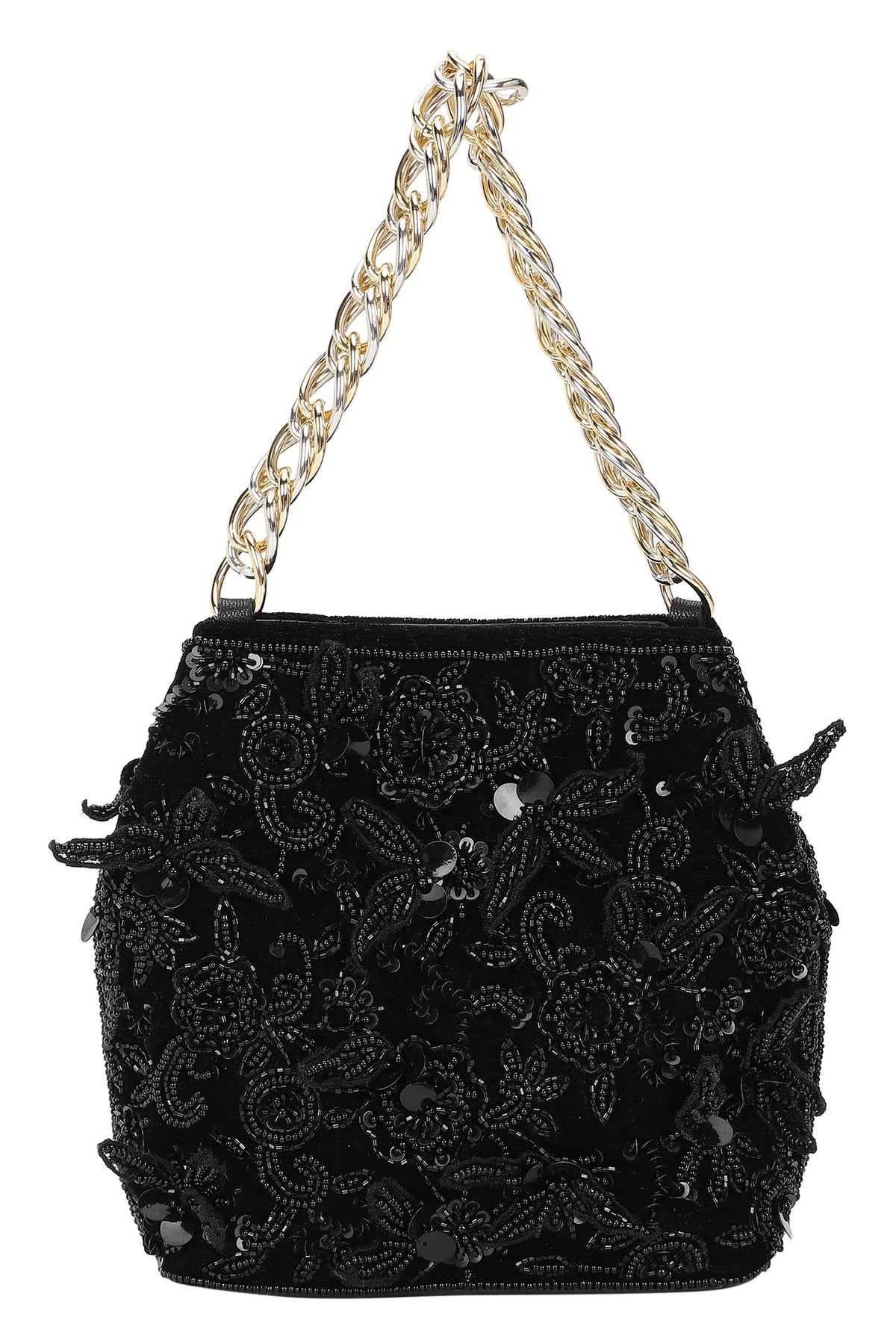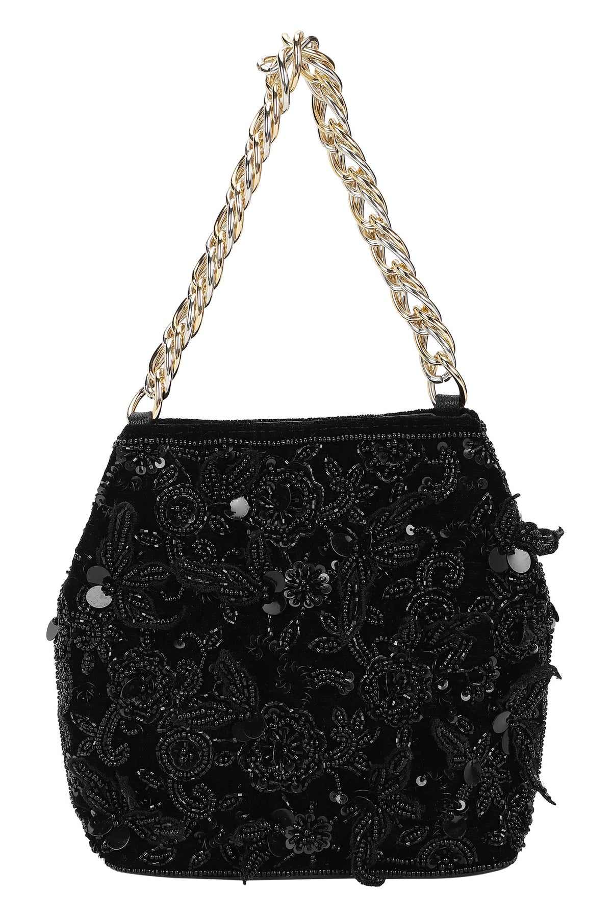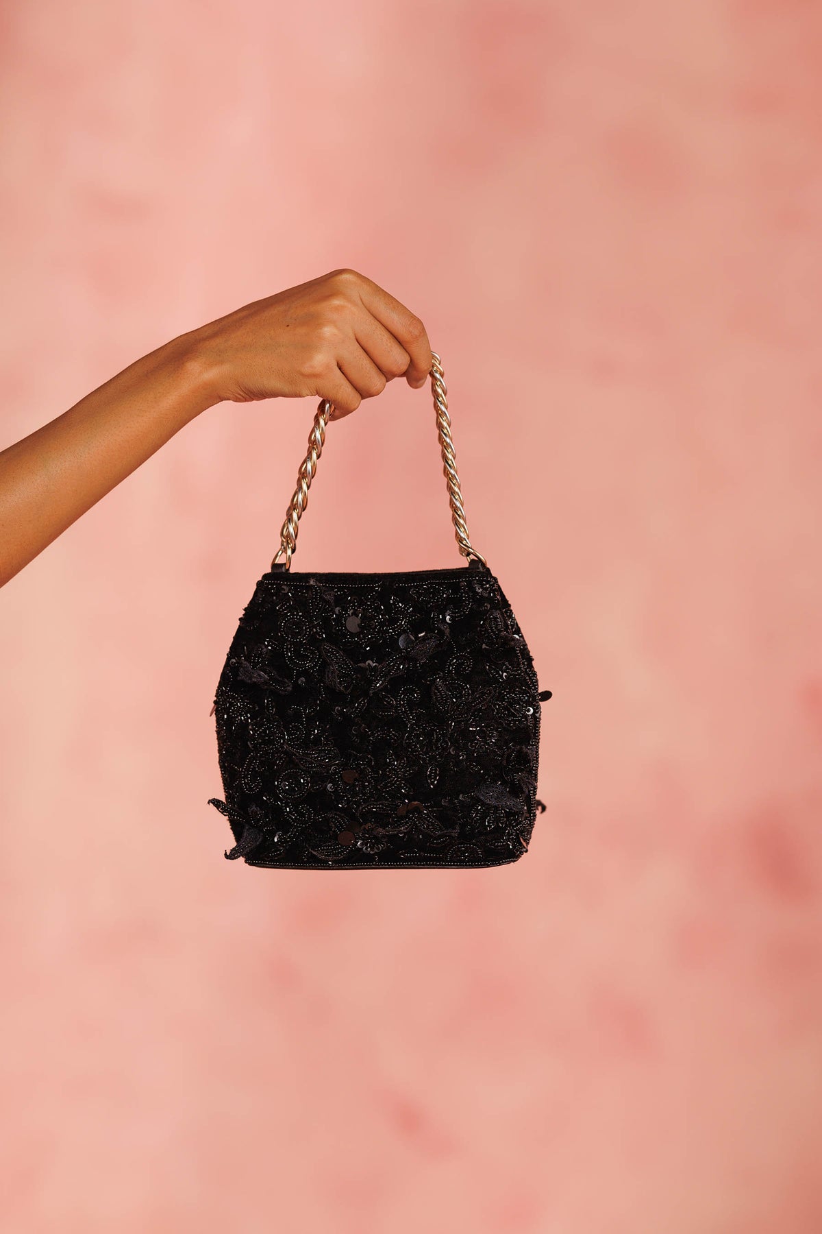 Elegant handcrafted potli bag adorned with intricate floral embroidery and beadwork in black tones. The delicate 3d petal details adds traditional charm with a modern touch, making it perfect for festive occasions and weddings.