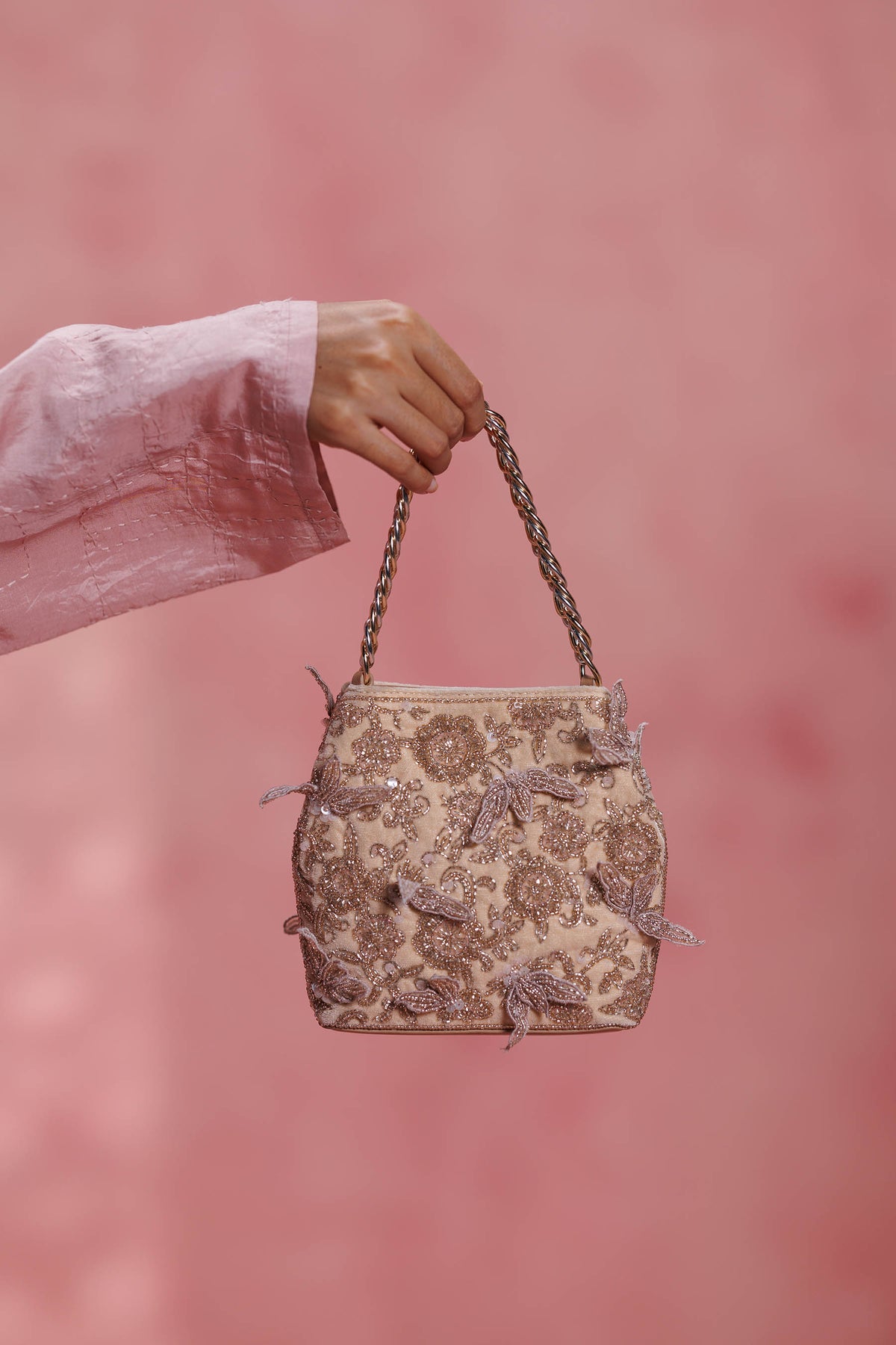 Elegant handcrafted potli bag adorned with intricate floral embroidery and beadwork in blush tones. The delicate 3d petal details adds traditional charm with a modern touch, making it perfect for festive occasions and weddings.