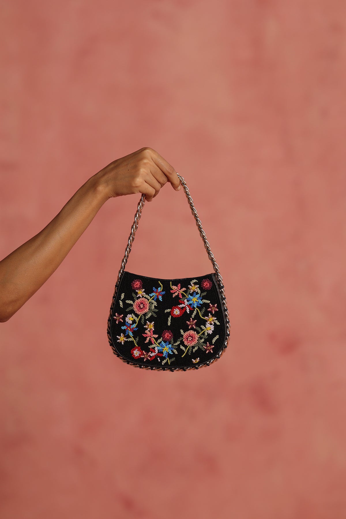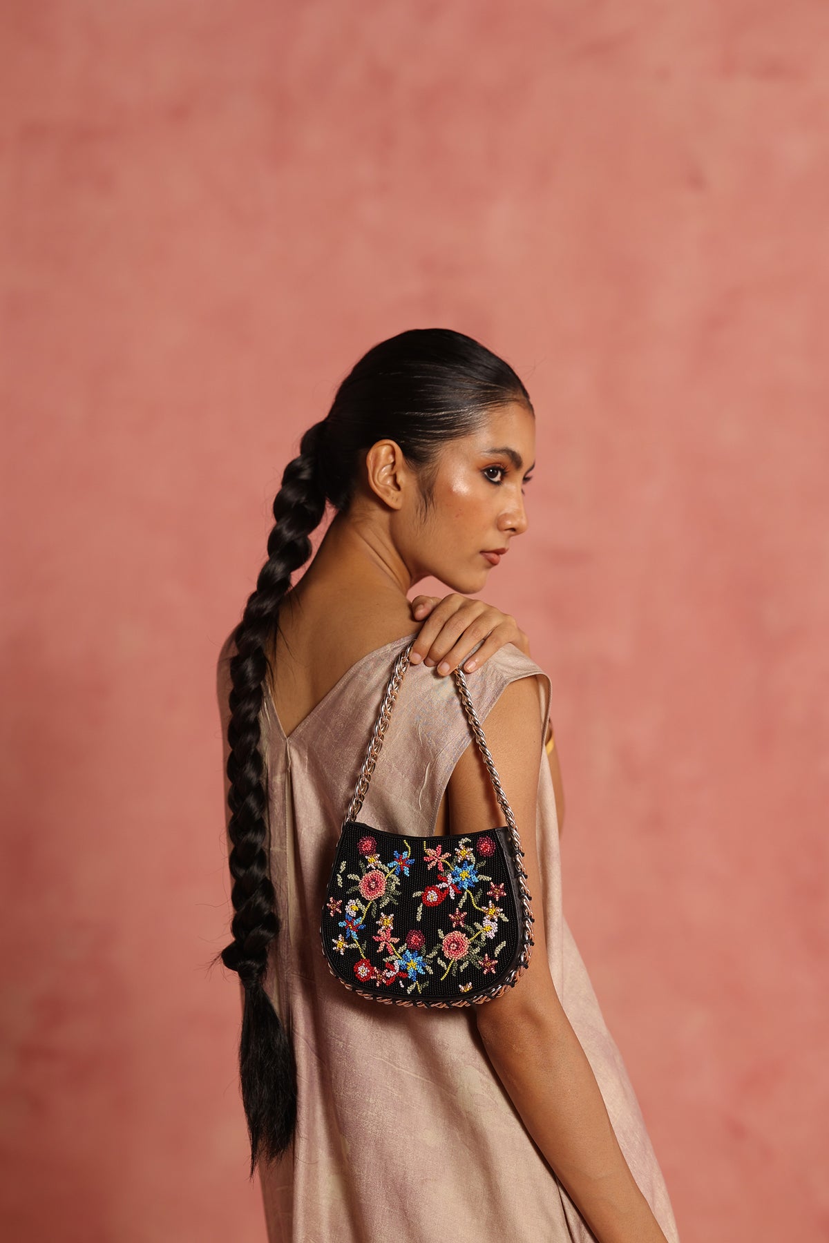 Any variations in the leather or the fabric are the characteristic of the product and add to its beauty and uniqueness. To avoid any accumulation of dust, please store your product in its dust bag when not in use. To maintain the shape of the bag, please keep the bag with its original stuffing when not in use. Embroidery and embellishment is done by hand and should be handled with care. Exposure to liquids may cause damage. Keep away from sunlight and extreme temperatures.