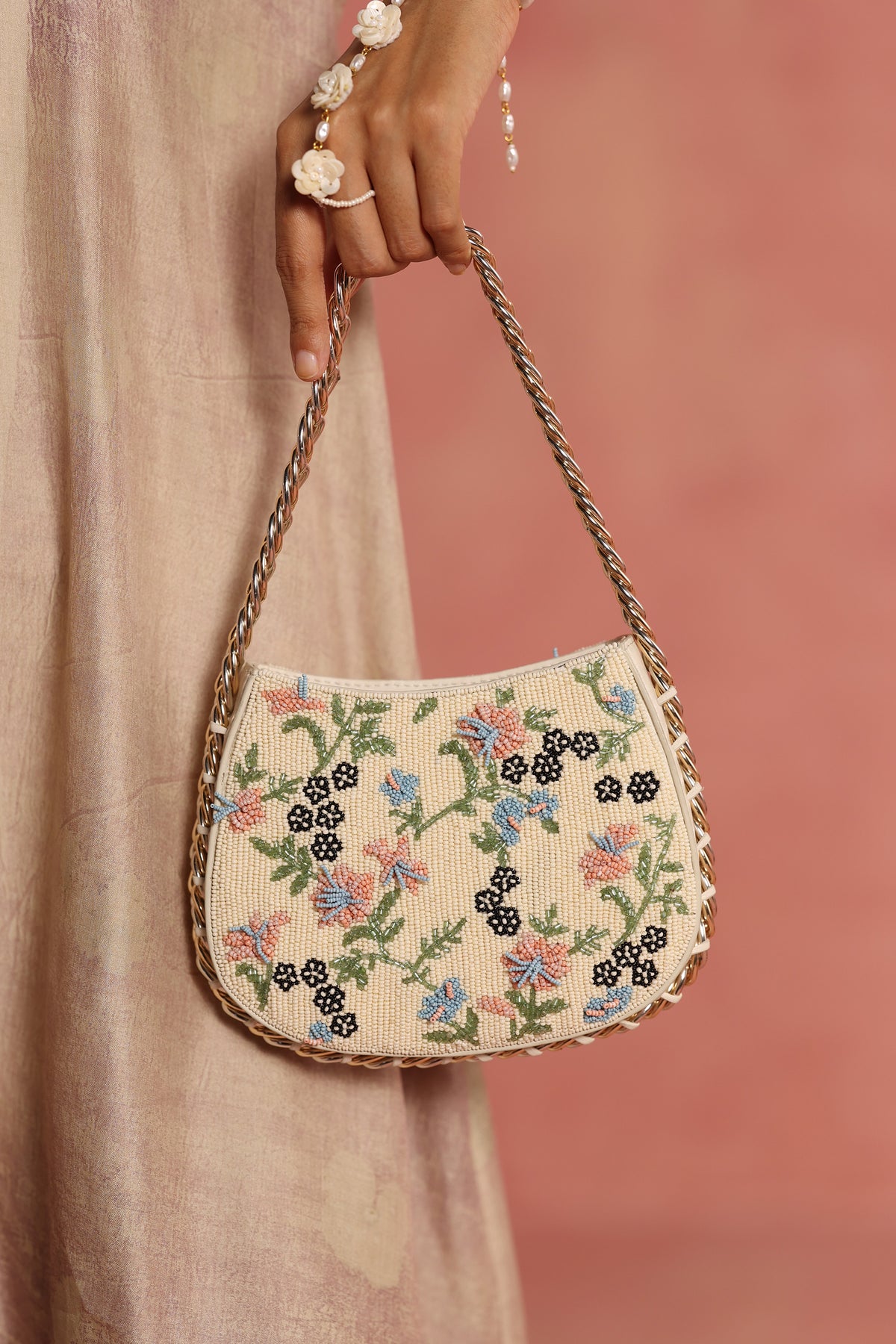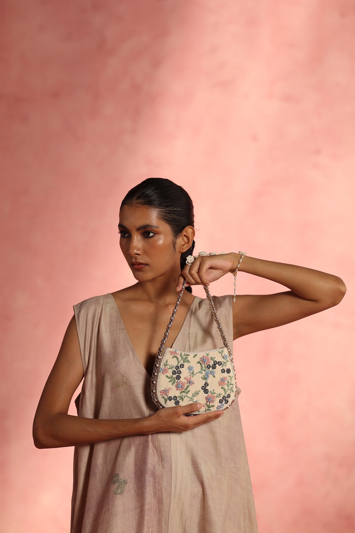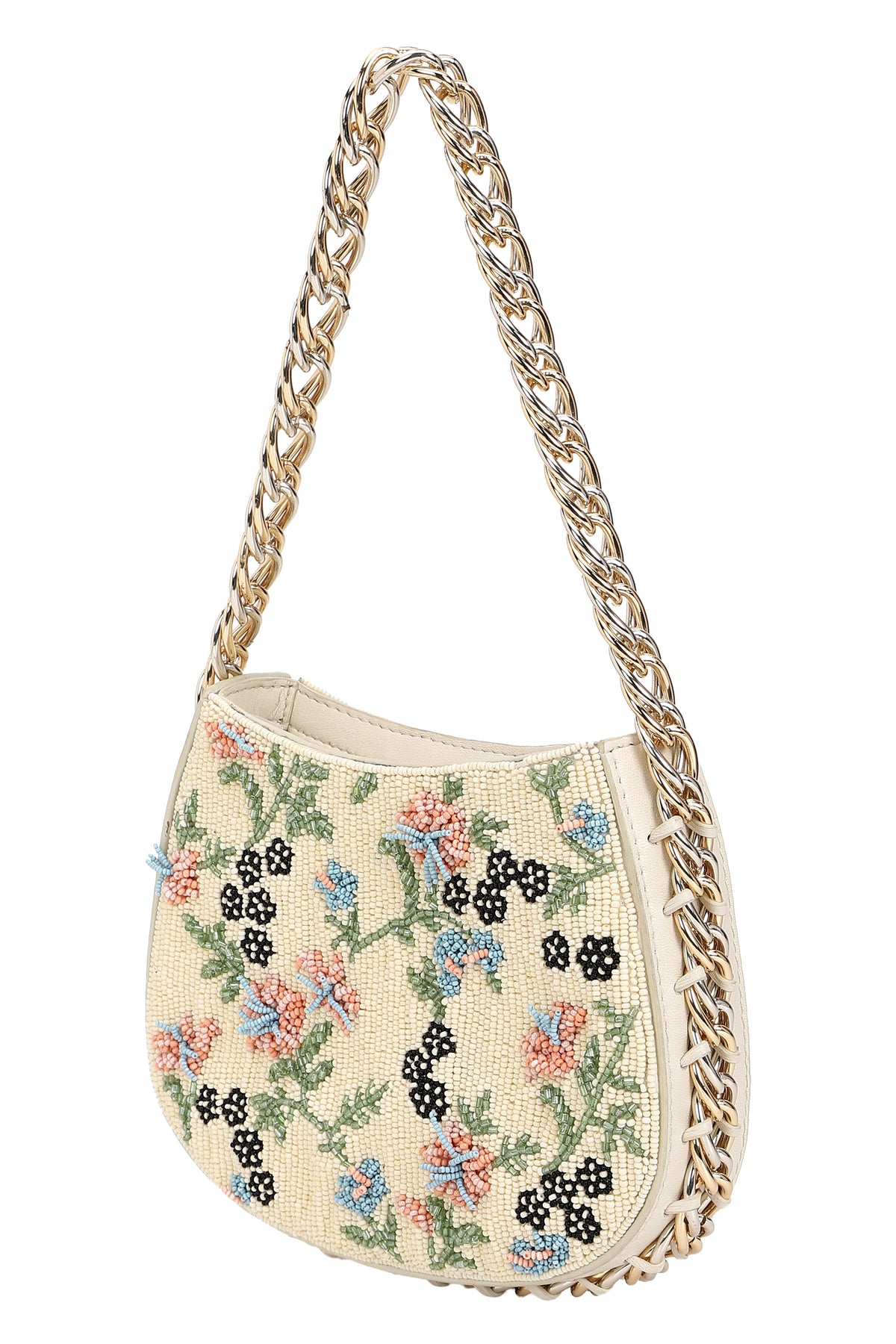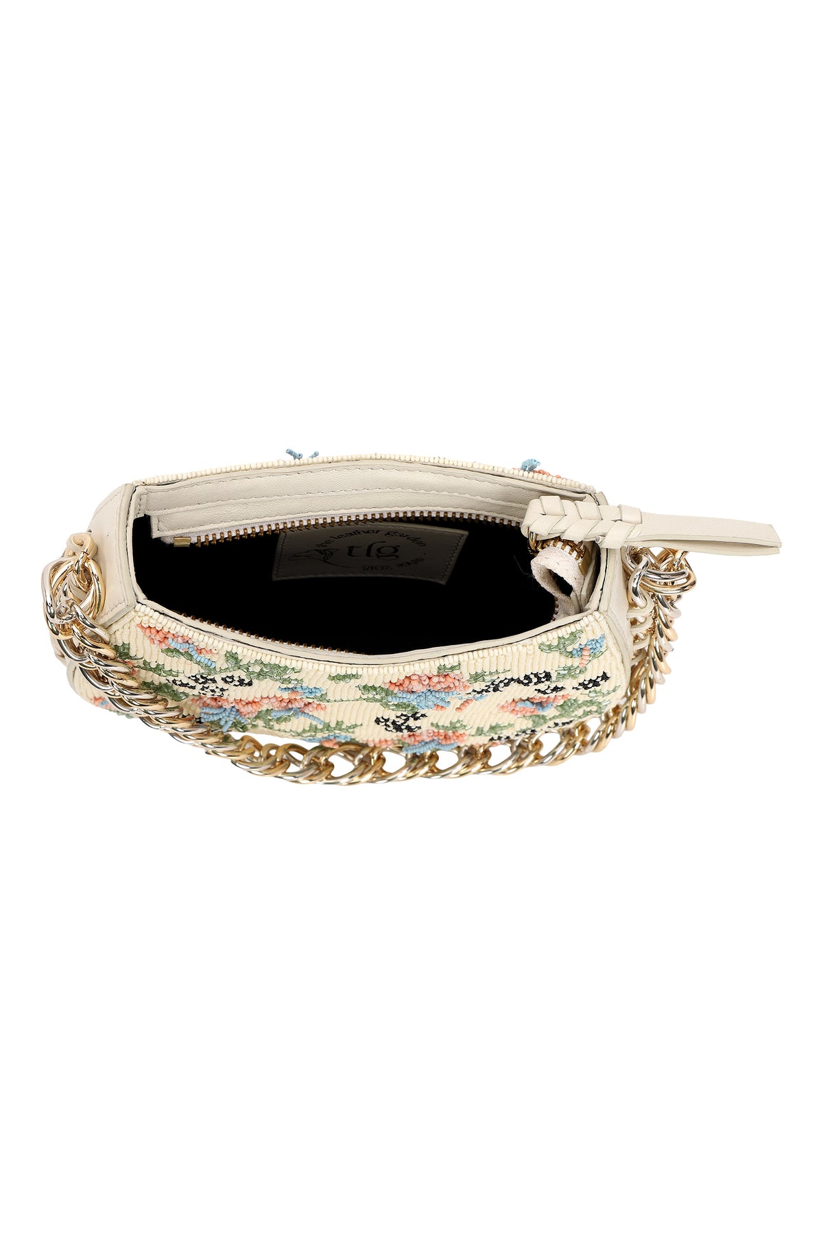 Any variations in the leather or the fabric are the characteristic of the product and add to its beauty and uniqueness. To avoid any accumulation of dust, please store your product in its dust bag when not in use. To maintain the shape of the bag, please keep the bag with its original stuffing when not in use. Embroidery and embellishment is done by hand and should be handled with care. Exposure to liquids may cause damage. Keep away from sunlight and extreme temperatures.